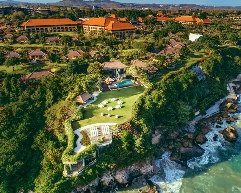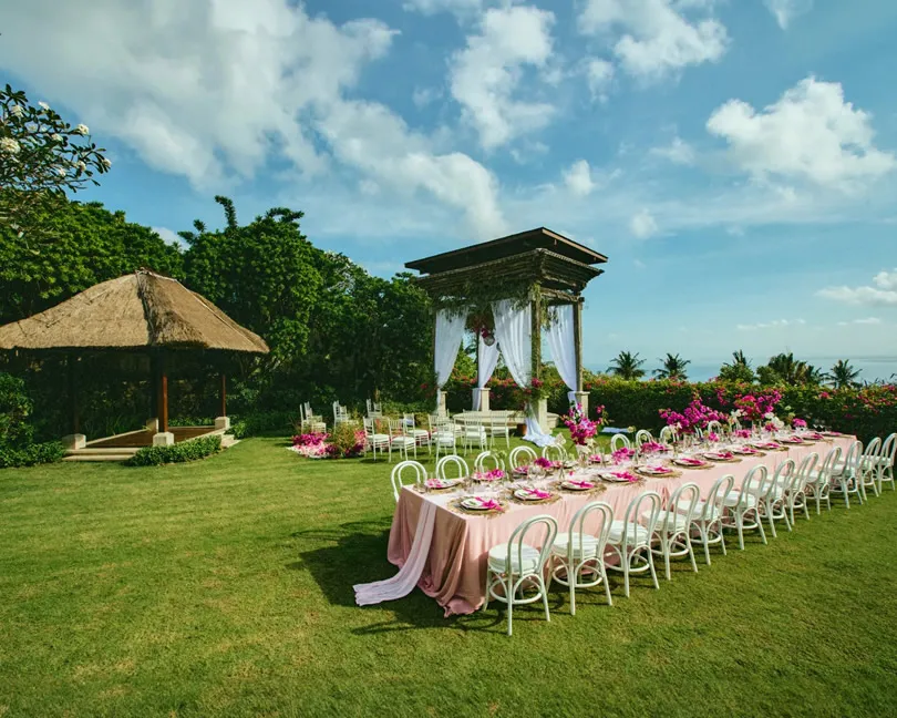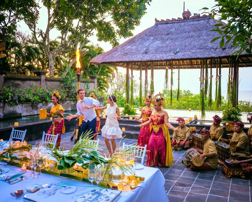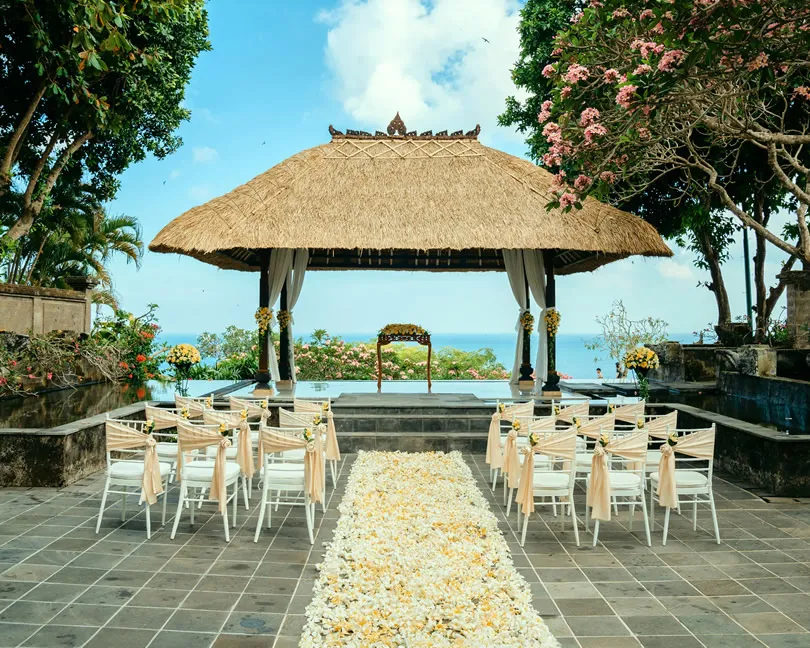 Bale Kencana 是一處充滿峇里島傳統氛圍的夢幻場地,讓您在享受壯麗自然美景的同時,體驗濃郁的文化韻味。面向遼闊的印度洋,涼亭四周環繞著繁茂的熱帶花園與靜謐的池塘,營造出與世隔絕的恬靜氛圍。別具一格的石板路和象徵峇里島文化精髓的天地門,更為這裡增添了獨特的魅力,令人印象深刻。