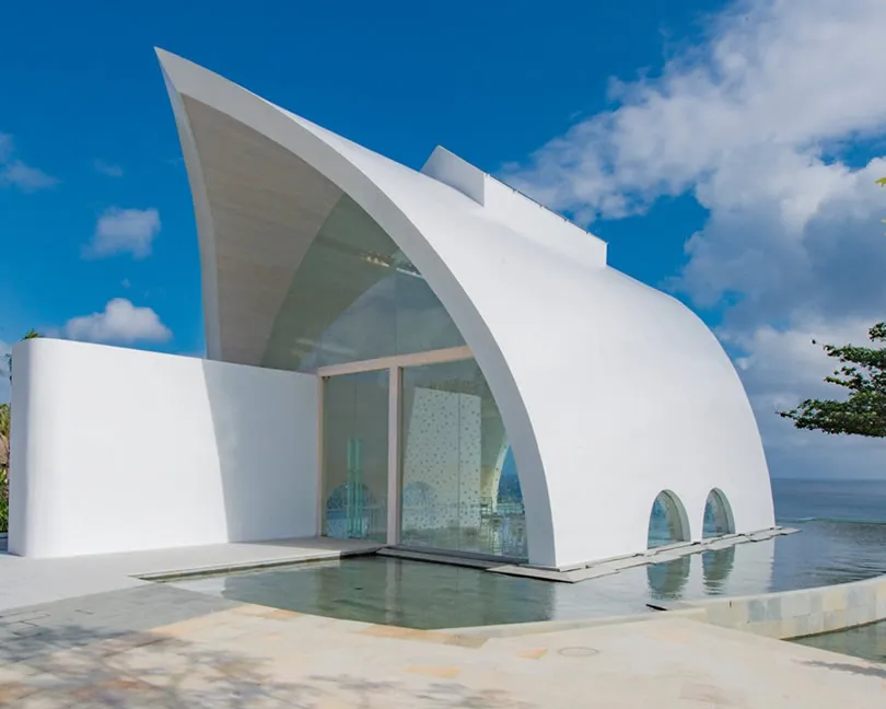 特里斯納教堂猶如一座浪漫的玻璃宮殿,聳立於波光粼粼的印度洋之上,展現出無與倫比的優雅之美。其標誌性的三角形屋頂設計,搭配全景視野,讓人一踏入便感受到純淨與神聖的氛圍。教堂內外皆以潔白為主色調,點綴著晶瑩剔透的水晶裝飾,猶如星光般為戀人們的幸福時光增添璀璨光芒。