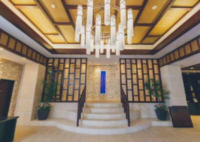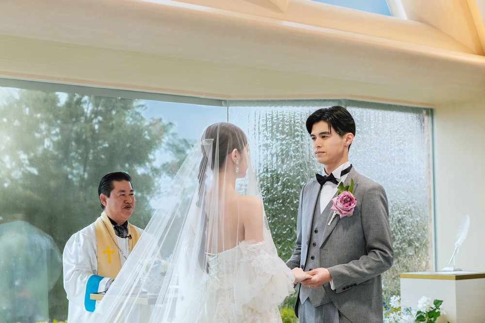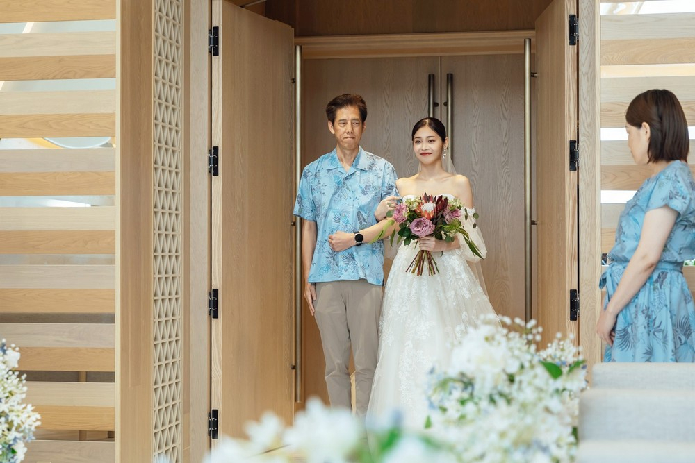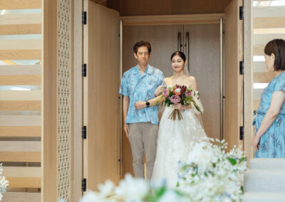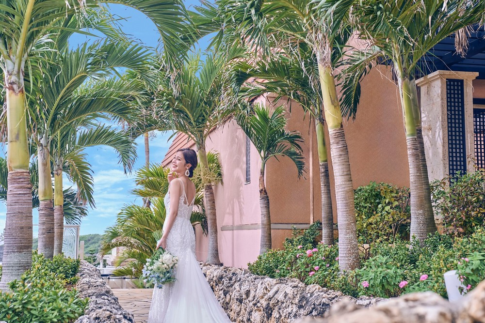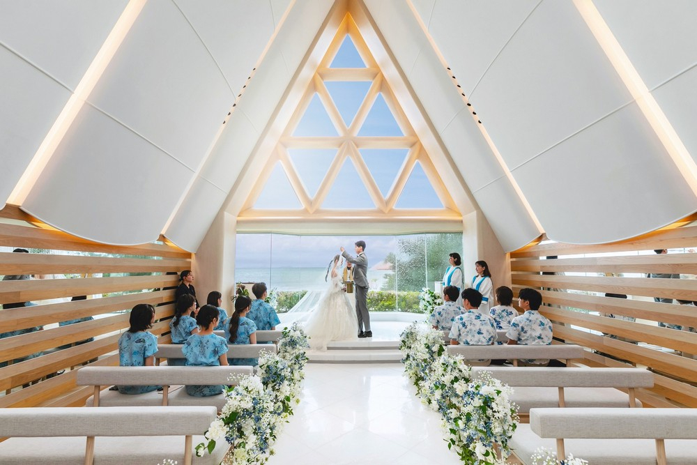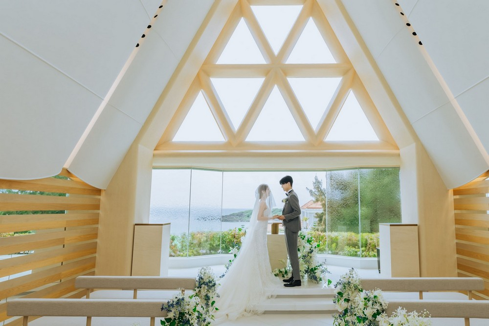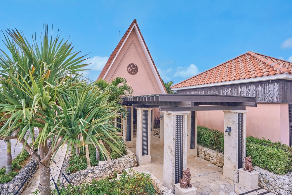 入口兩側棕櫚搖曳,花草扶疏,彷彿步入一處祕密的花園禮堂。教堂正面高聳的三角屋脊,宛如一面展開的帆,引領新人航向嶄新的旅程。屋簷之下,是以沖繩石牆與天然木梁構築的拱門長廊,為步入神聖誓言的時刻增添一絲儀式感與靜謐。