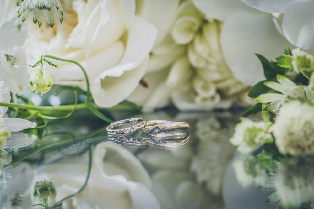 白色花卉與婚戒在光影交織下閃爍著細膩的情感,彼此的承諾靜靜躺在鏡面上倒映未來。
