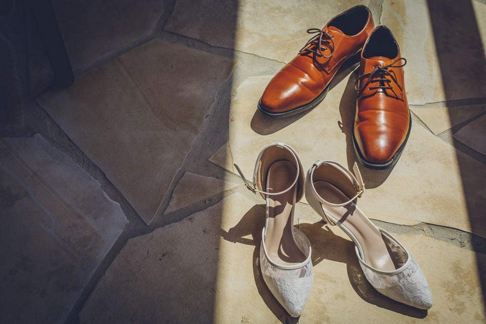 皮革紳士鞋與蕾絲高跟鞋在晨光中並肩而立,那是兩段人生即將交織的最佳象徵。