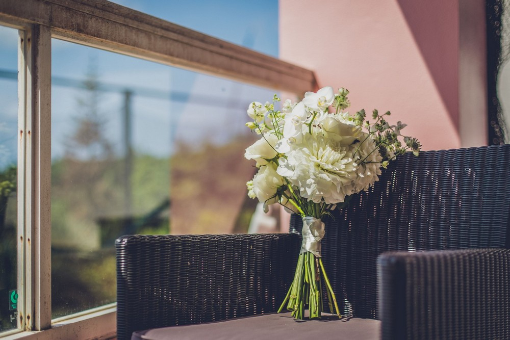 花藝設計以潔白為基調,與窗外南國綠意相互輝映,洋溢著純淨與典雅。