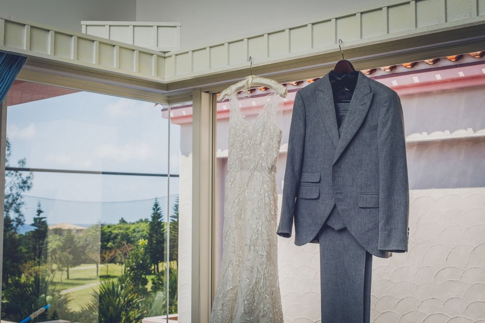 禮服與西裝懸掛在落地窗前,陽光透過玻璃灑入,為即將穿上的那一刻鍍上一層命運的光暈。