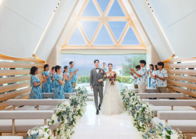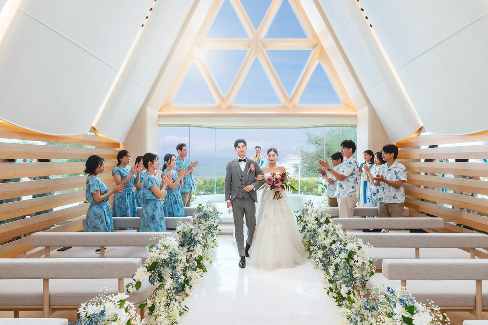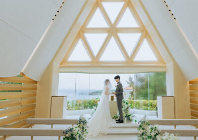 在柔和光線灑落的祭壇上,眺望著蔚藍天空與大海,交換彼此的誓言。「ShigiraMarina Chapel」是一座模仿純白船隻所建的教堂,蘊含著祝福新人從此啟航、未來一帆風順的美好願望。高達8公尺的斜屋頂設計,象徵著迎風膨脹的風帆。讓我們從這座教堂出發,高舉風帆,展開一段通往廣闊大海的嶄新旅程。