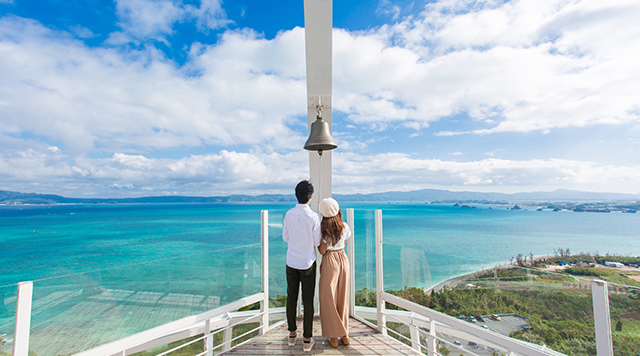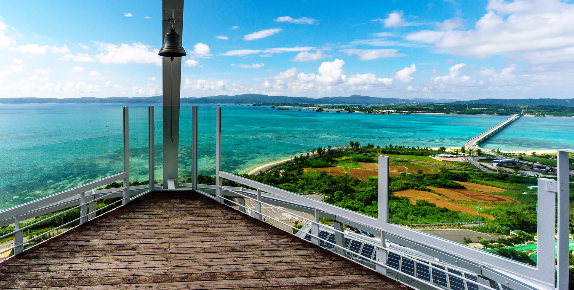 連接今歸仁村的古宇利島和名護市的屋我地島,全長2,020m的橋,於平成17年2月8日開通。可算是日本最長的橋。古宇利島是個周長約5公里,開車不用10分鐘就能環島一圈的小島。從海拔82公尺的高處俯瞰長達2公里的古宇利大橋全景, 東海和羽地內海那被稱作翡翠海的美景盡收眼底, 無比壯觀。海洋塔上還有一個敲響幸福的愛之鐘可以去拍照留念. 這裡還有聚集了1萬件以上來自世界的各種貝殼的“貝殼博物館”,有個只有古宇利專有的愛心貝殼極為美麗,也是因此而被稱為戀之島的原因,附設有貝殼飾品的專賣店及咖啡廳及作坊。