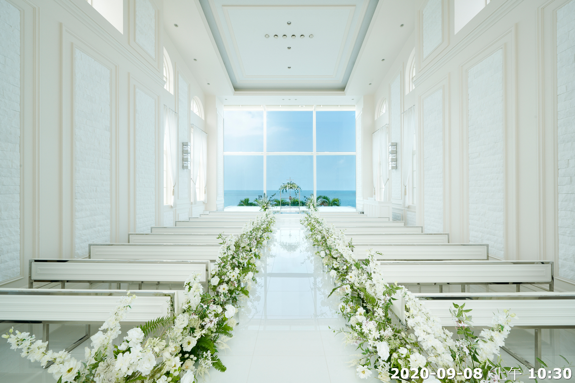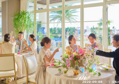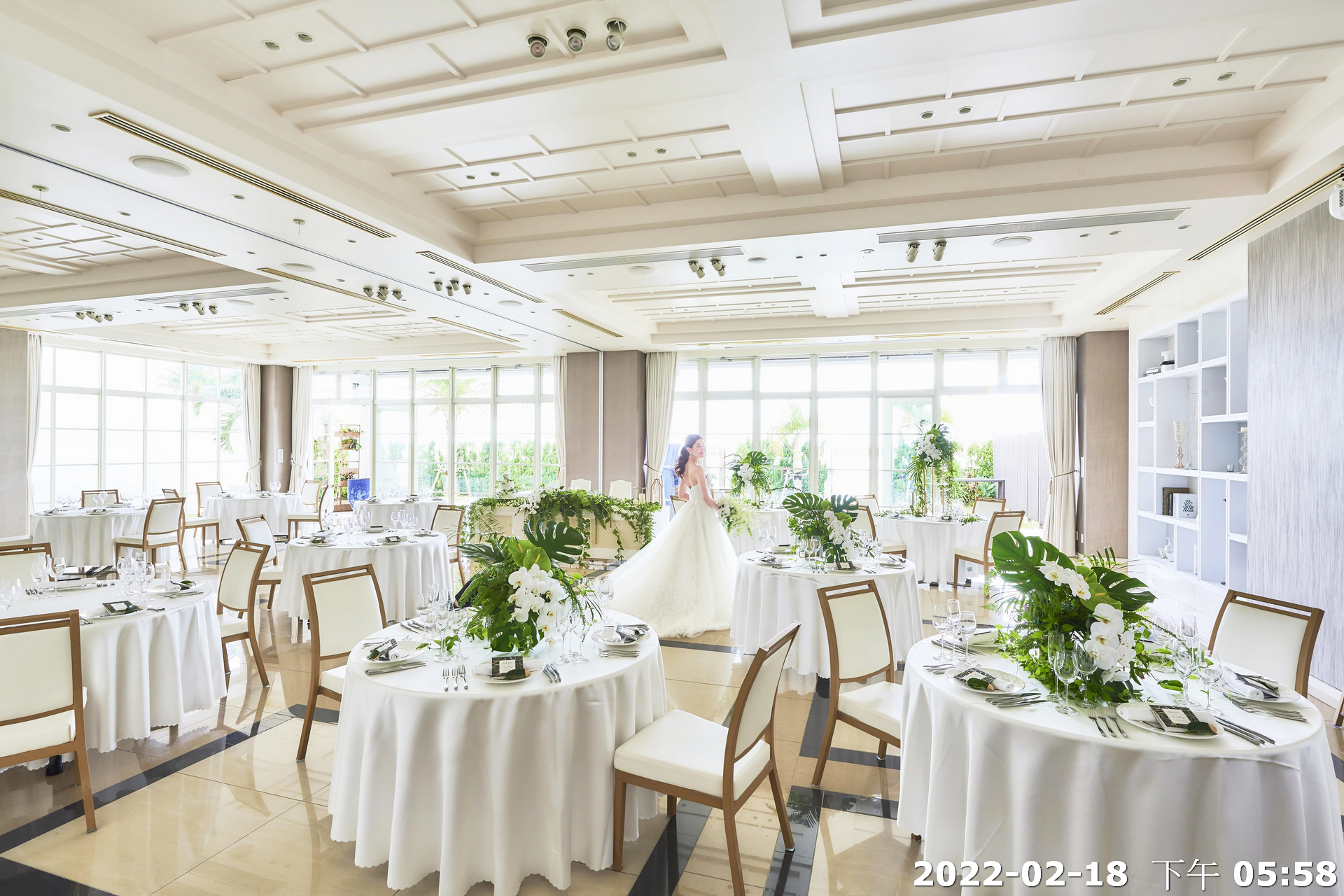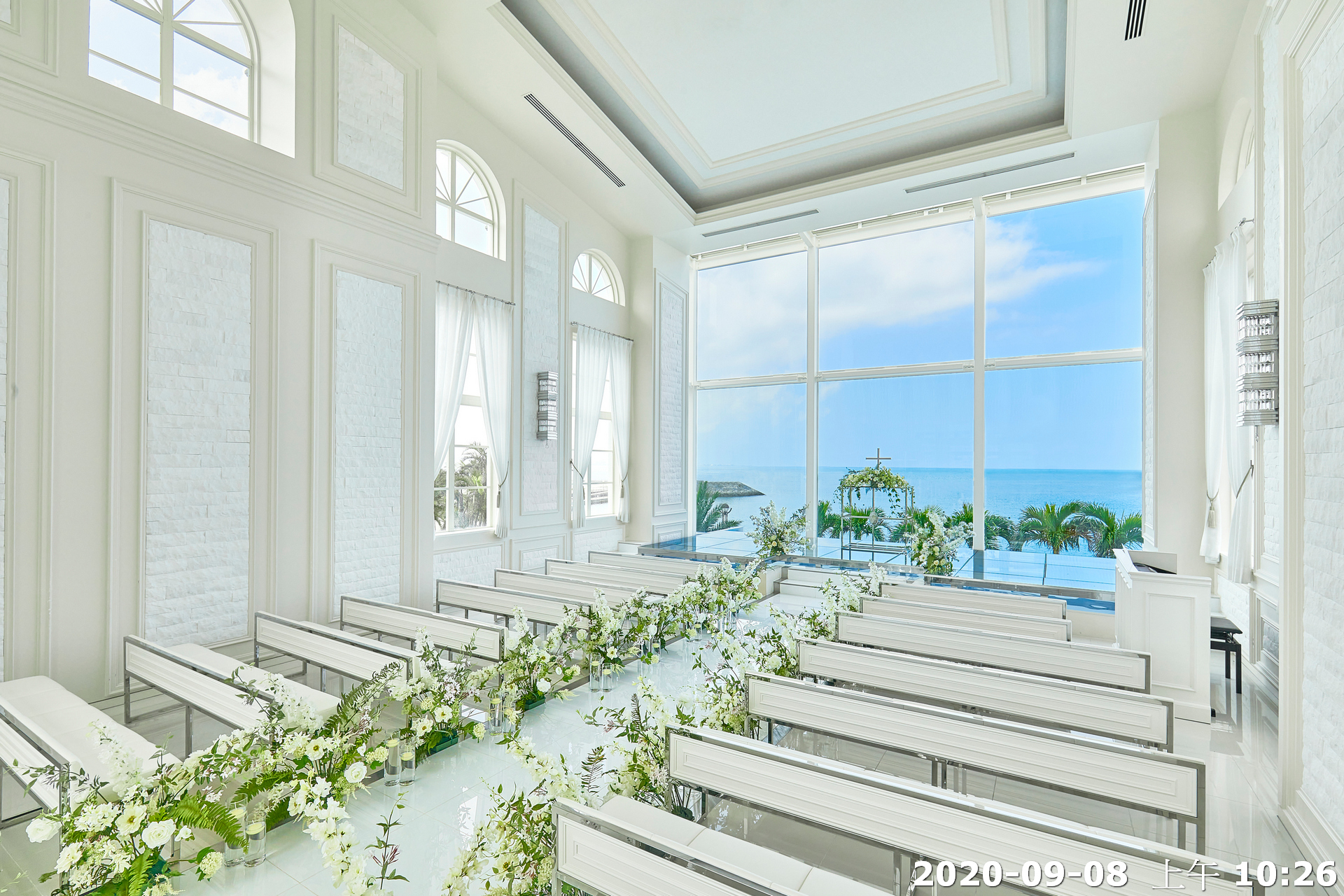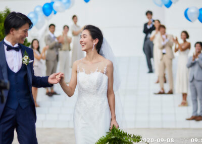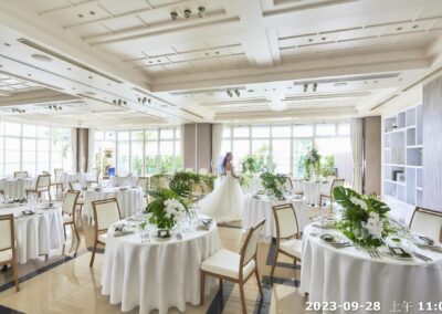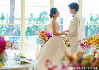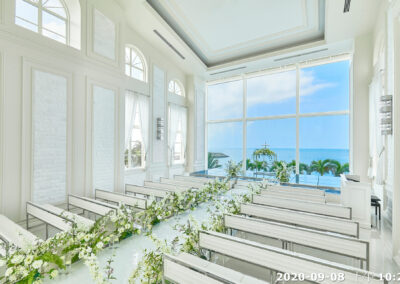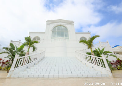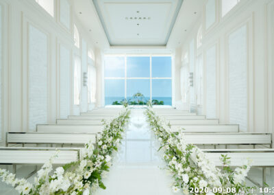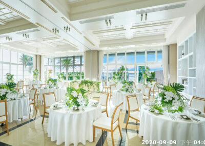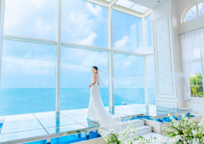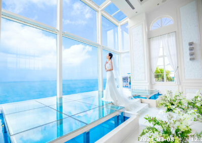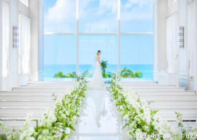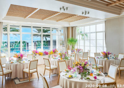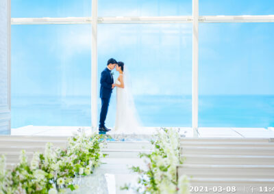 地點:位於沖繩海邊,擁有大片落地窗,可直接欣賞熱帶海景與椰子樹景致。結合教堂儀式與婚宴空間的一體式婚禮場館,新人可以在同一地點完成儀式與宴會,無需移動。