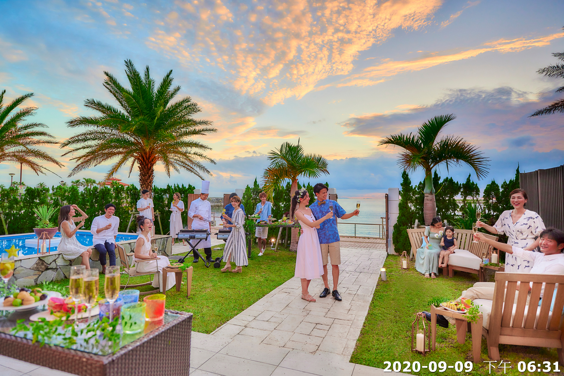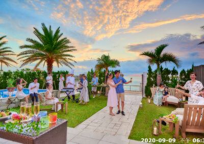特色:靠海草坪與泳池,夕陽時分特別浪漫。:雞尾酒會、甜點桌、戶外派對或婚禮拍攝)。氛圍:自然、放鬆,非常適合日落後點燈的晚宴氛圍。